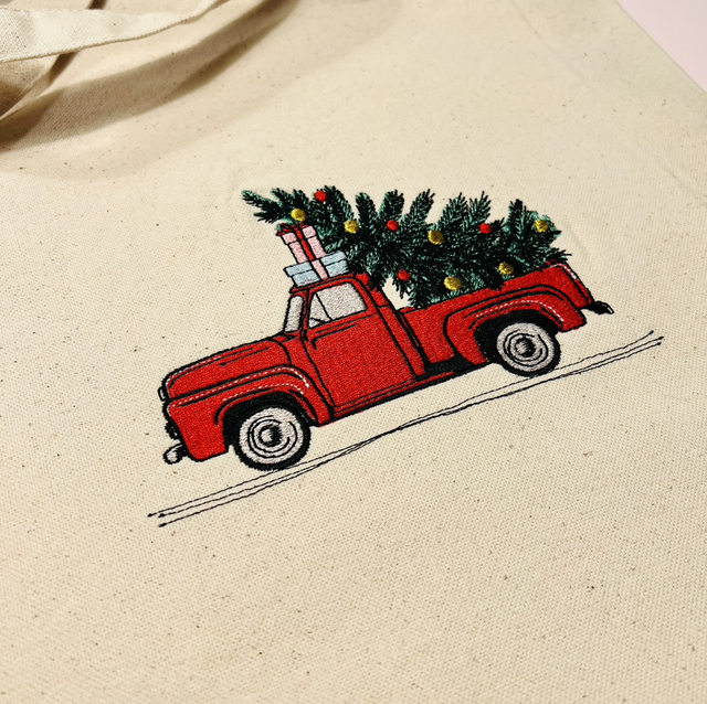 Broderiet er udført i klassiske julefarver med et diskret strejf af glimmer, der giver et elegant og festligt udtryk.